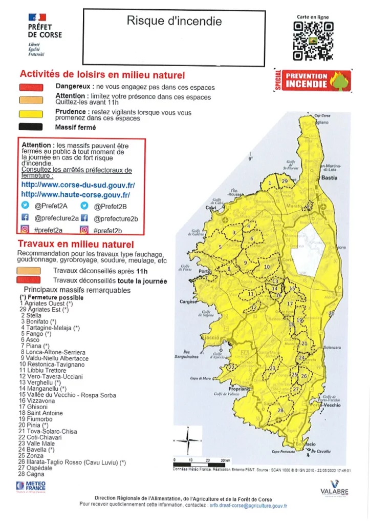 Pendant la saison des feux de forêts, la préfecture de Corse informe quotidiennement sur l’intensité du risque d’incendie.