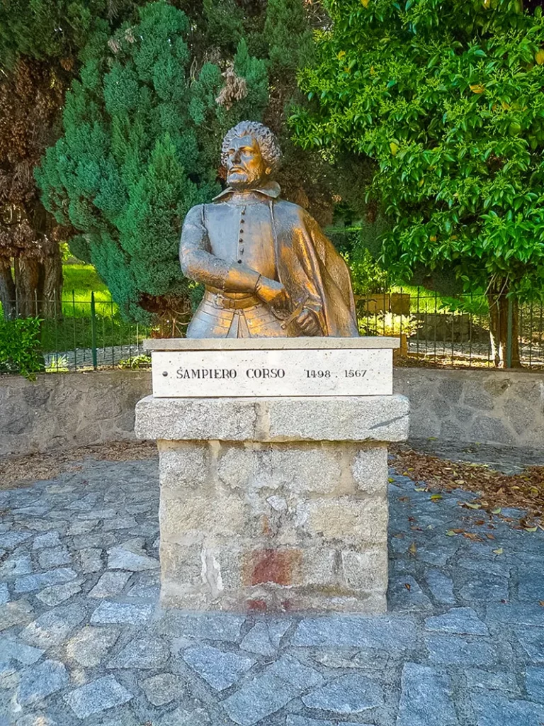 Le buste de Sampiero Corso est du au ciseau de Louis Patriarche, sculpteur et médailleur né à Bastia le 28 septembre 1872 (décédé à Nîmes, 13 mai 1955). Formé à Rome, à l’Académie royale des Beaux-Arts, puis à l’Ecole nationale supérieure des Beaux-Arts de Paris, Louis Patriarche est le sculpteur qui a connu le plus de succès et de popularité tant auprès des Corses de Paris qu’en Corse, au cours d’une carrière qui couvre une période de près de cinquante ans. Parmi ses œuvres situées en Corse : à Bastia, le monument aux morts de la place Saint-Nicolas et le médaillon buste de Sampiero Corso également à Bastia, à Calvi la porteuse d’eau, à Ajaccio, le médaillon d’Emmanuel Arène.