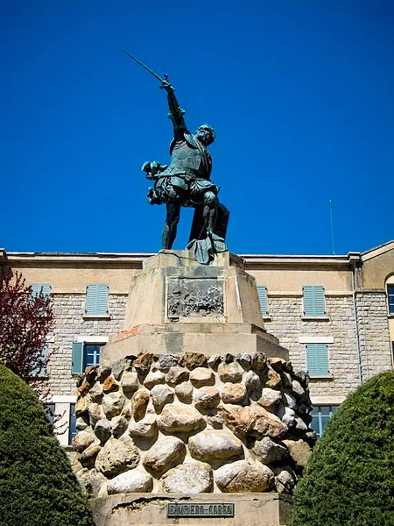 Sur la place principale, entre l’Église-cathédrale Saint-Michel et l’important groupe scolaire en pierre de taille, se dresse l’imposante statue de l’illustre Sampieru héros immortel des luttes de l’indépendance contre Gênes. Haute de trois mètres cinquante, en bronze, sur un piédestal en granit de sept mètres, elle a été inaugurée le 21 septembre 1890 par Monseigneur de la Foy évêque de Corse, devant une foule énorme, en présence des autorités civiles et militaires. Les bas-reliefs : le siège de Perpignan, la bataille de Tenda, les campagnes militaires, l’assassinat, rapportent tous à la vie de Sampieru Corsu.